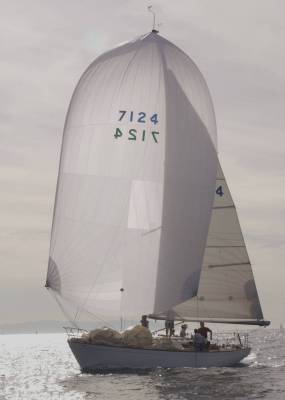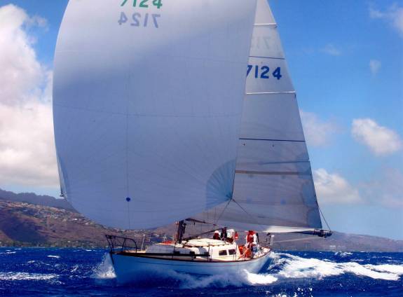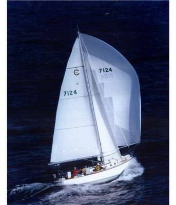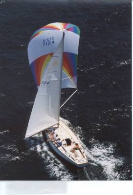 Sails:  All by North.  3DL Main. 3DL 155, .  .6 Poly primary chute.  .5, .75, and 1.5 Nylon back-ups.  As our local PHRF does not penalize Asymetrics, I’ve recently ordered a 1.5 Asymetric from North.  Kevlar-Mylar #2 (140%).Our current favorite is the 7 oz Dacron, full-hoist “blade”, which is sheeted to the middle of the deck, just aft of the mast.  I this seems to be the perfect sail for 14 kts+ TWS 18-20 AWS.However, you can only sheet such a sail if you remove the forward lowers.  We have a full set of cruising sails, so we wash and fold the “good stuff” after racing (we even fold the spinnakers) so they last a long time.