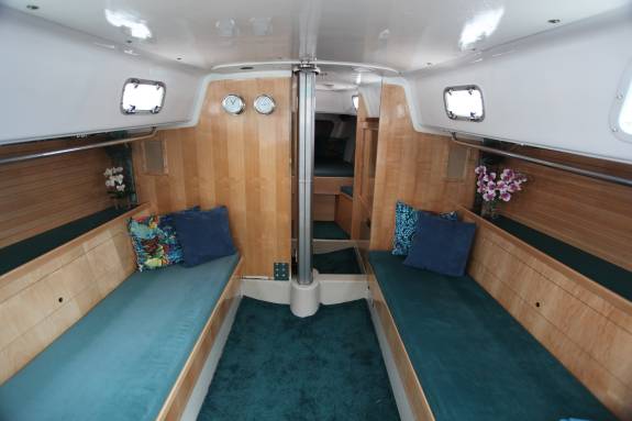 Interior Lighting: Incandescent “dome” style s/s fixtures, one on the overhead just aft of the mast (I ran its power source up through the mast and out), one under the cockpit bridgedeck, two on each side in the galley, and one on each aft wall of the forward cabin for general illumination.  Each bunk has an elegant ABI (1806CH-D) chrome reading lamp (20 watt halogen with dimmer).We have LED replacements for the lights for off-shore racing.
